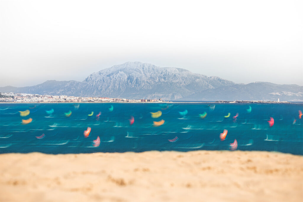 À Tarifa, deux régimes de vent dominent la période estivale : le Levante, un vent d’est souvent soutenu et irrégulier, et le Poniente, un vent d’ouest plus modéré et plus stable. Le Levante peut monter fort et s’orienter side-off, ce qui demande davantage d’attention et d’analyse du spot avant de se lancer, pour ne pas se faire surprendre à dériver.