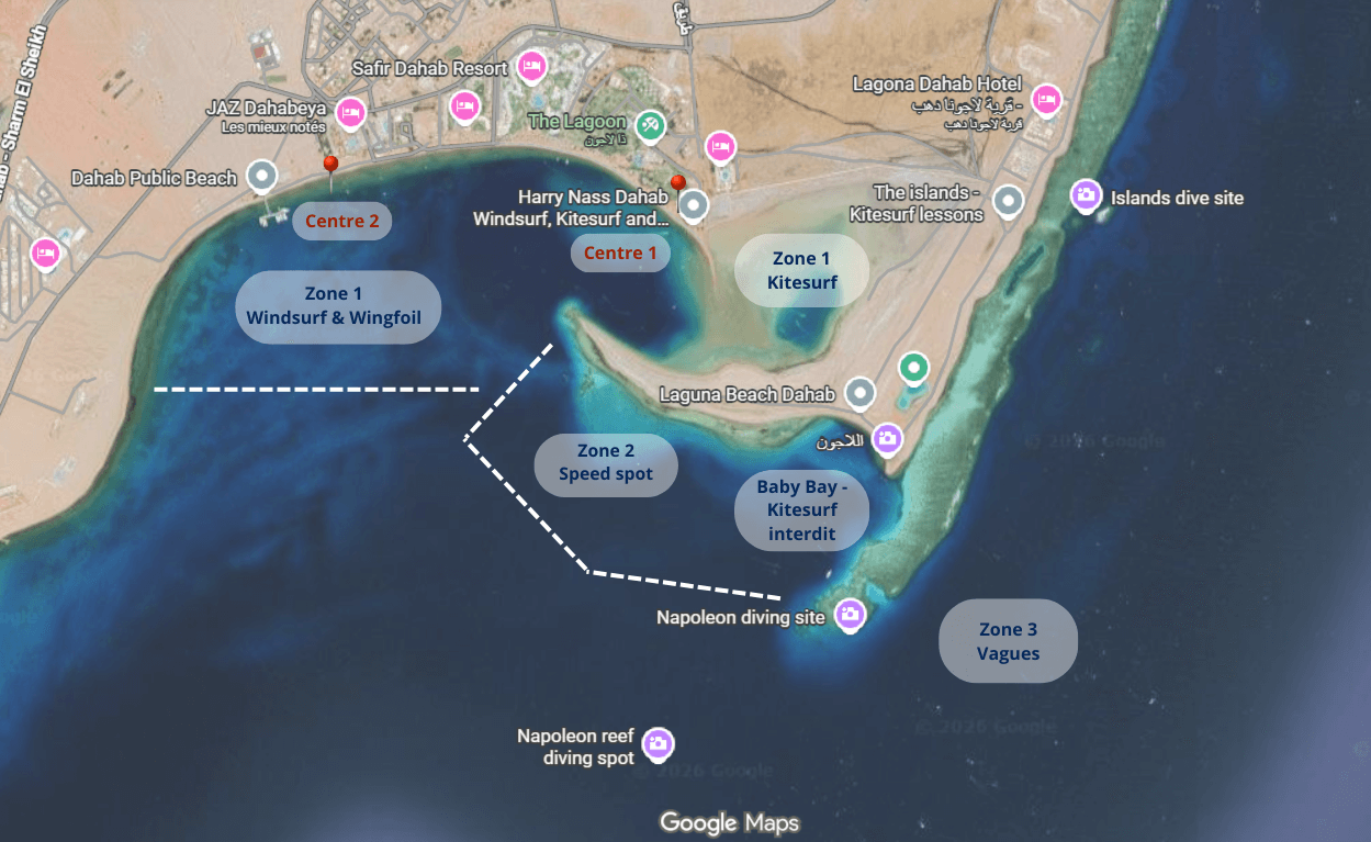 Le centre Harry Nass à Dahab propose kitesurf, windsurf et wingfoil avec encadrement premium sur deux bases face aux spots entre lagons, speed spot et vagues