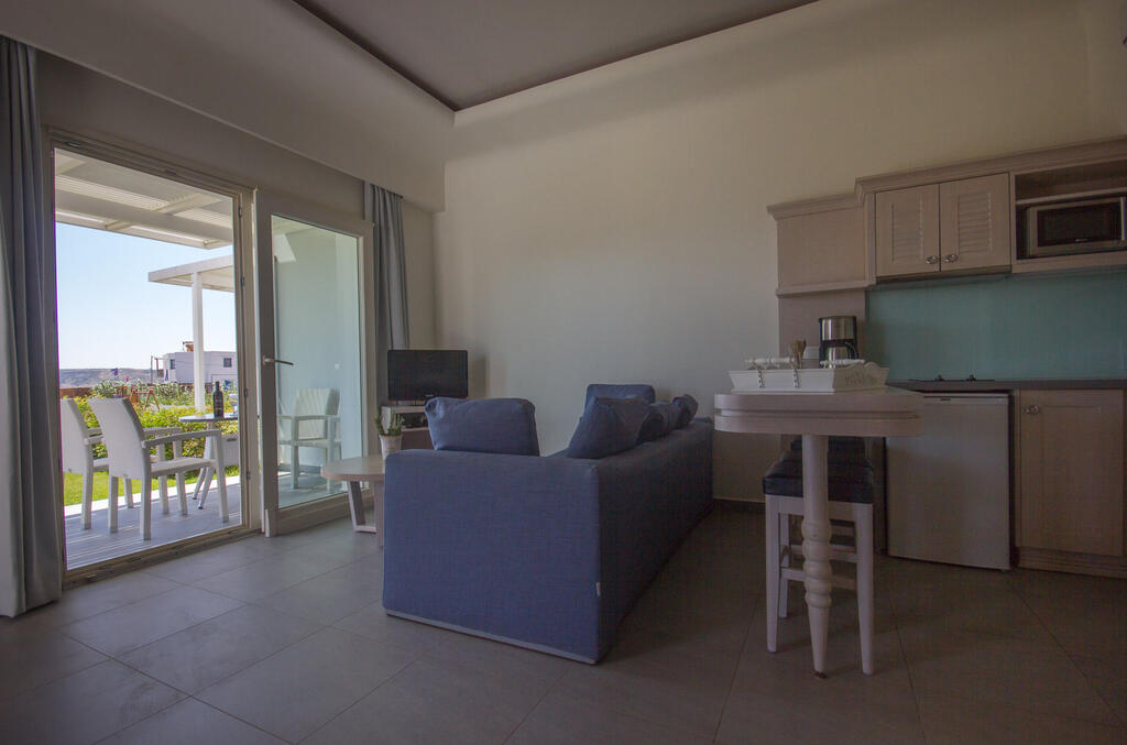 Salle de télévision, un beau jardin et une terrasse avec vue sur la mer pour le petit déjeuner.