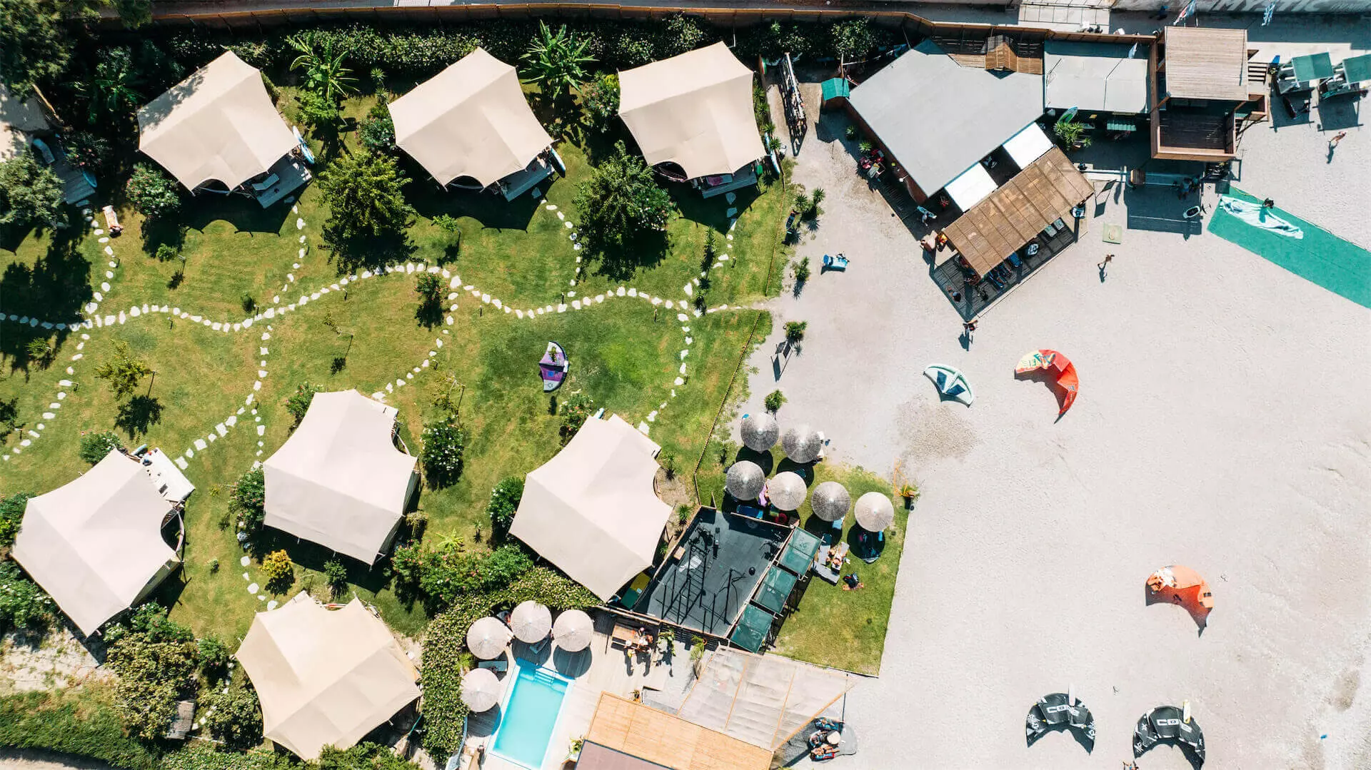Petite structure de 12 lodges, 4 studios, répartis sur une propriété d'un hectare, juste derrière le club et avec un accès direct et vue sur le spot de kite.