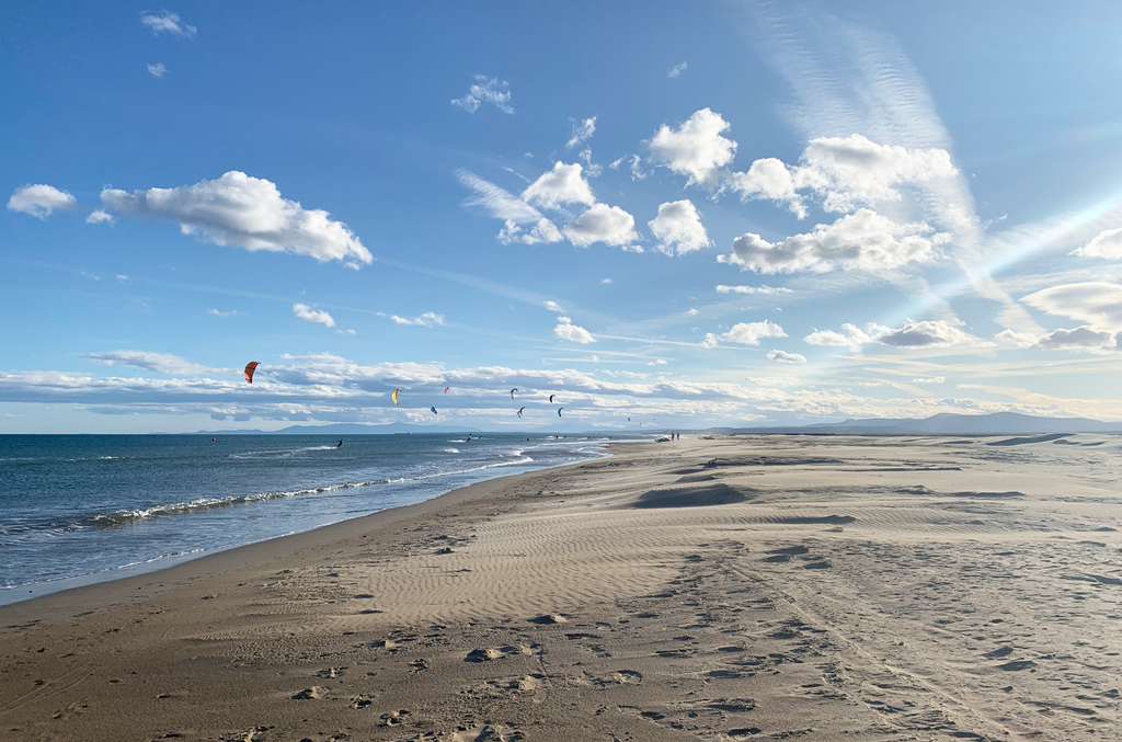 Durant tout l’été, le vent souffle régulièrement sur l’immense plage de Gruissan, moins fort mais bien assez pour des très longues sessions.